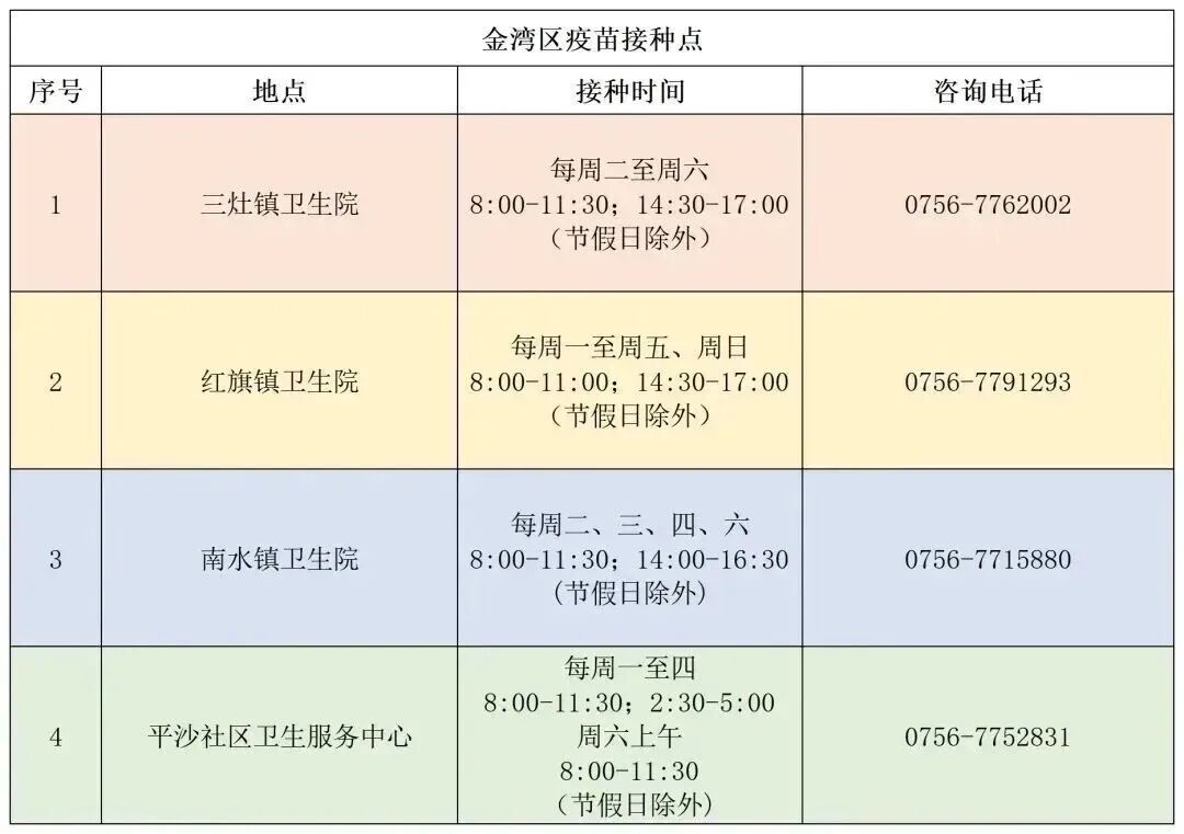 以下是金湾区疫苗接种点一览表