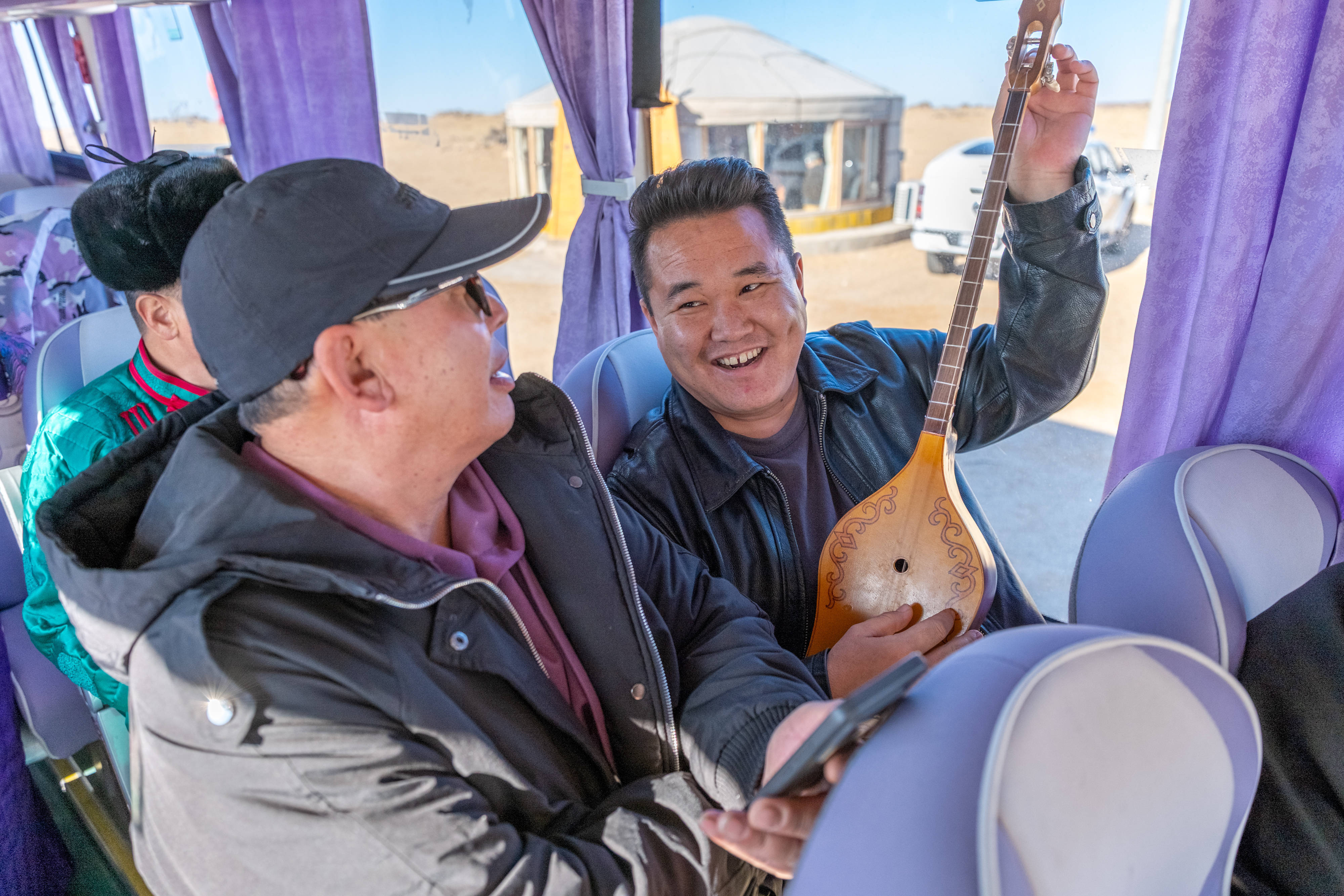 11月12日,乌云吉日嘎拉在大巴车上向其他演员演示乐器弹奏技巧。