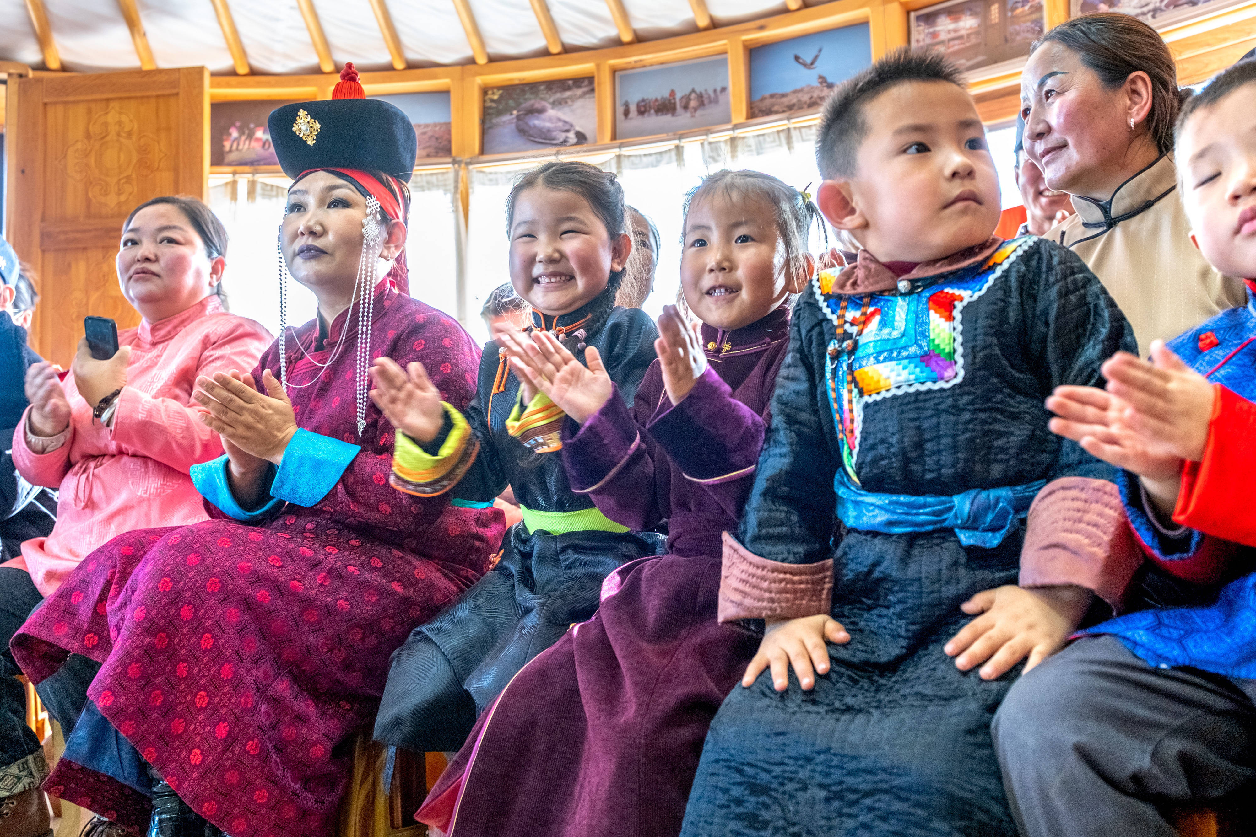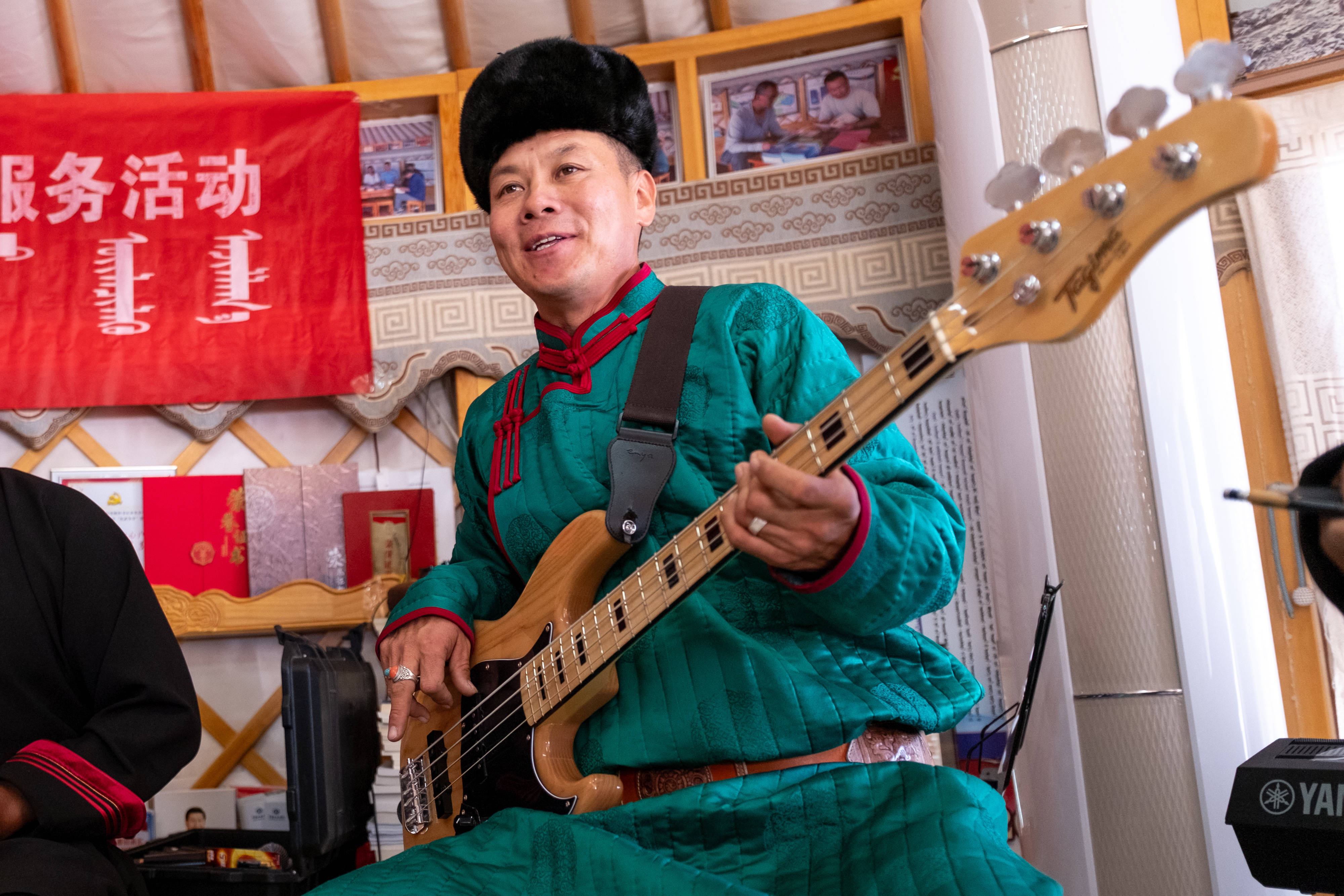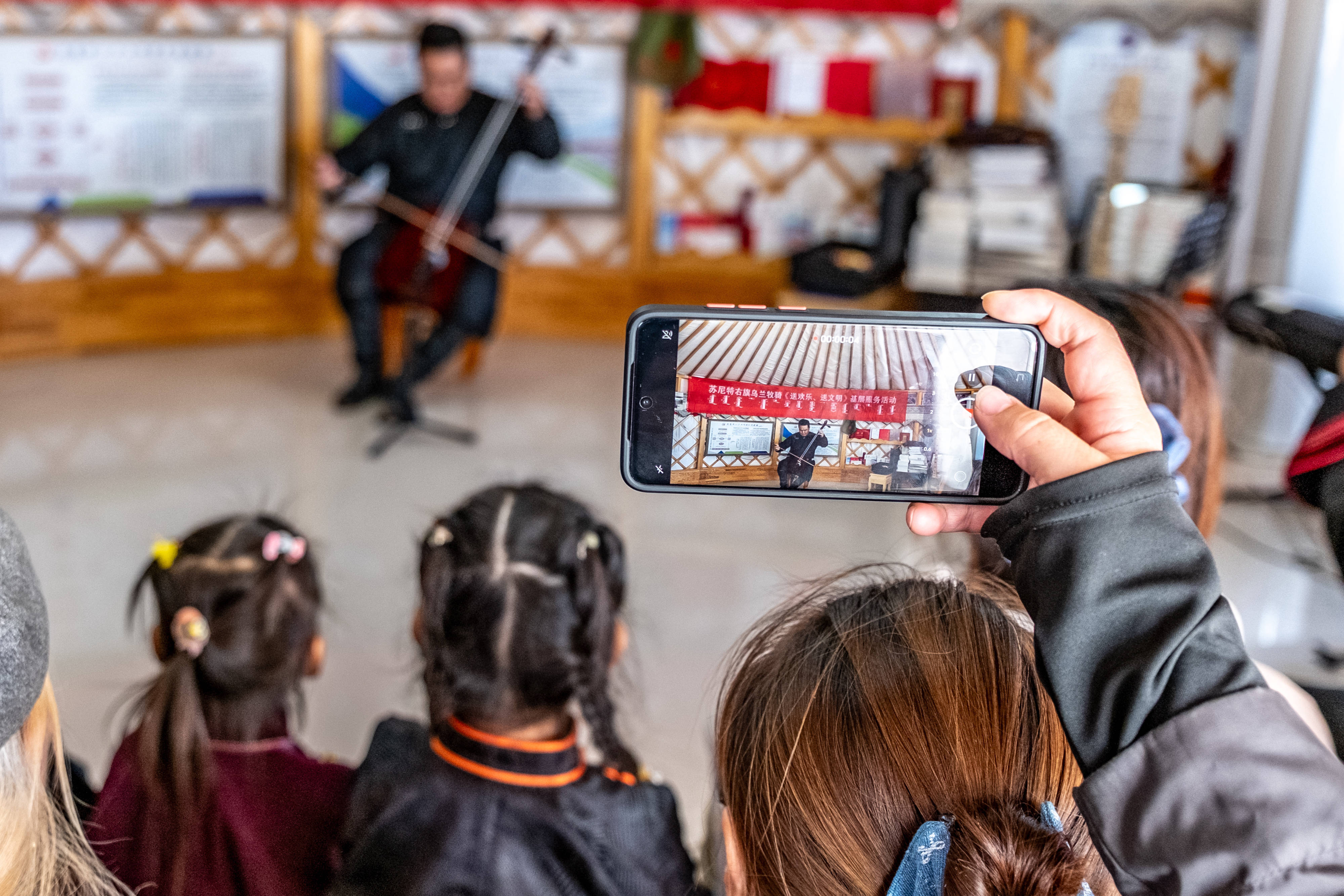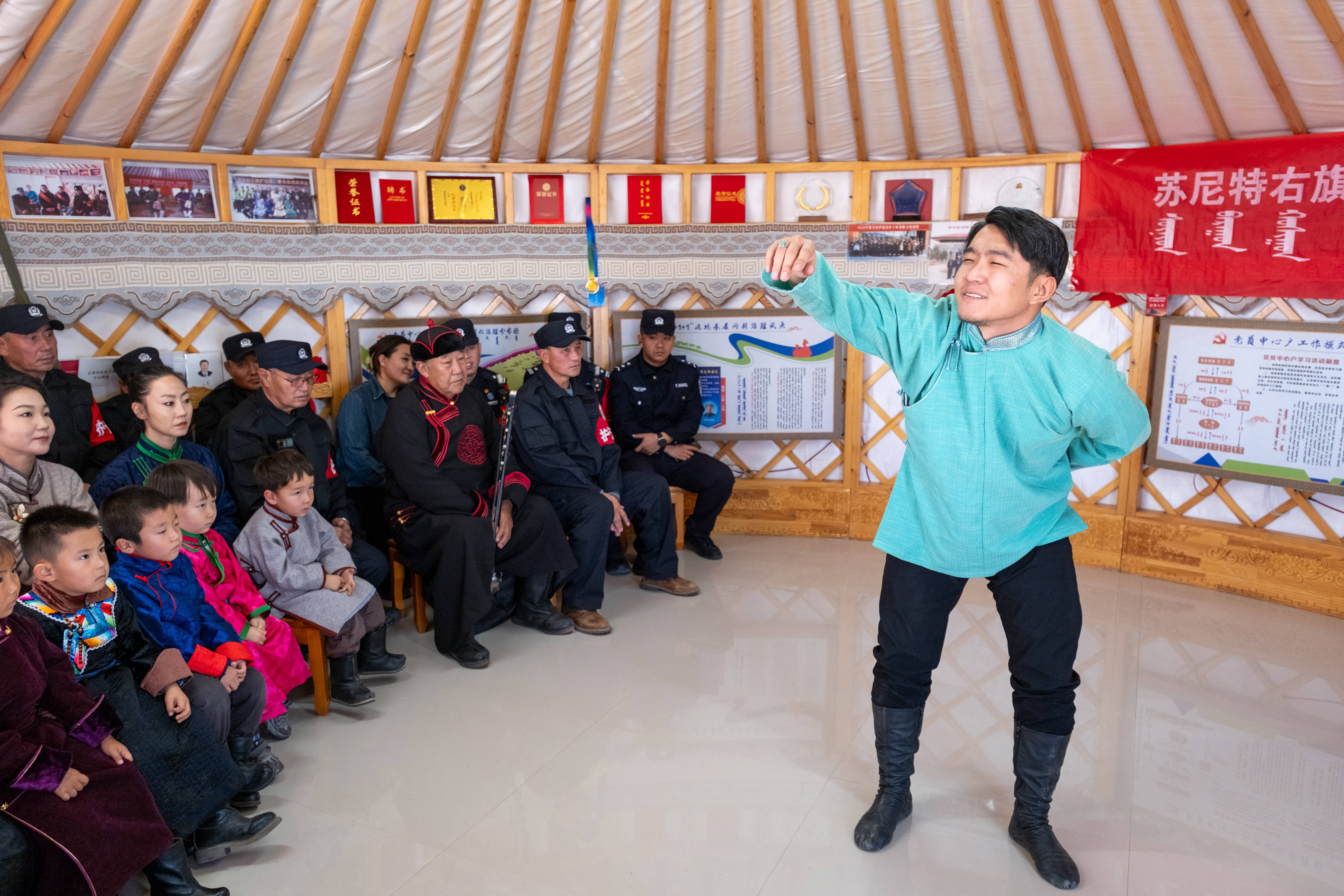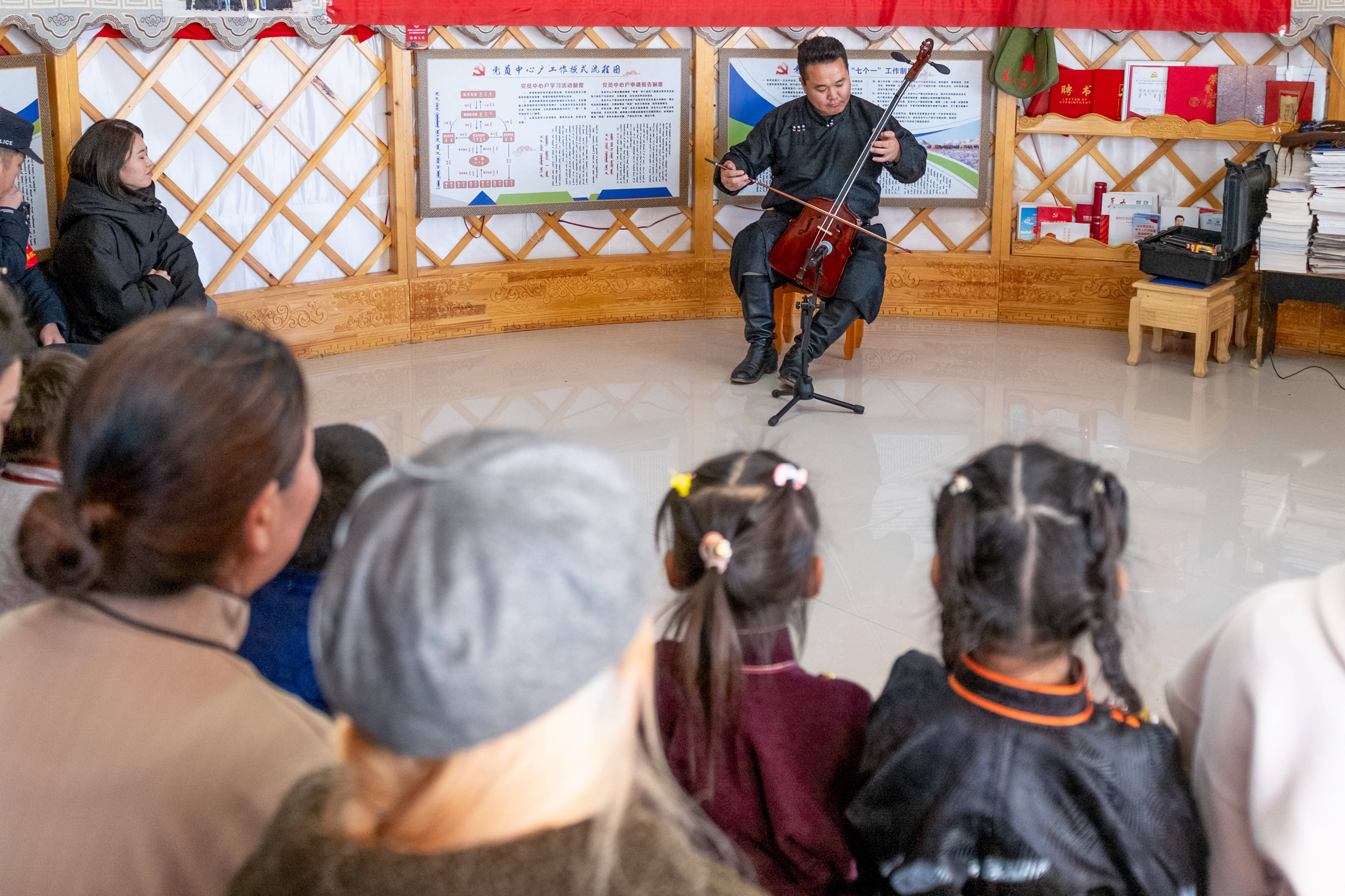 11月12日,在内蒙古锡林郭勒盟苏尼特右旗额仁淖尔苏木吉呼郎图嘎查赛音巴特尔护边驿站,“小小乌兰牧骑”的演员们在“送欢乐、送文明”基层服务活动中表演。乌云吉日嘎拉是苏尼特右旗乌兰牧骑的马头琴演员兼呼麦歌手。一专多能的他,13年来随队走遍了全旗7个苏木和58个嘎查,仍在坚守着“不落下一个蒙古包”的初心。