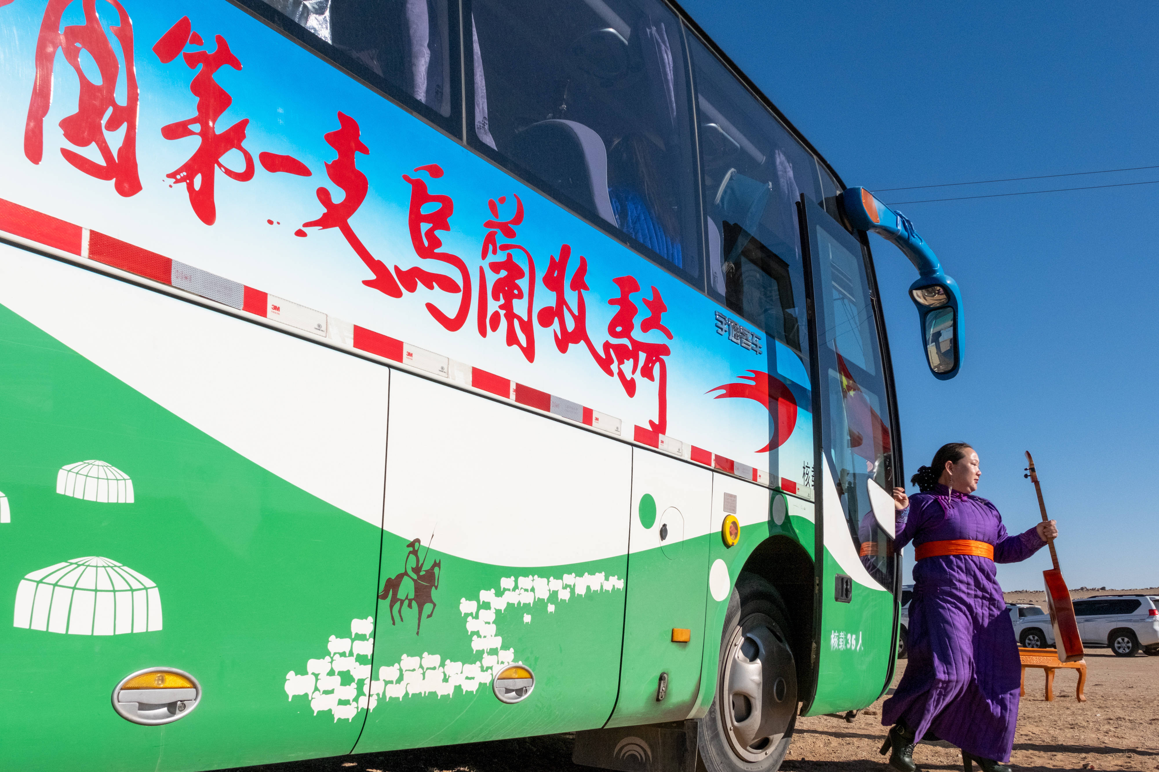 11月12日,在内蒙古锡林郭勒盟苏尼特右旗额仁淖尔苏木吉呼郎图嘎查,演员走出下乡演出的大巴车。