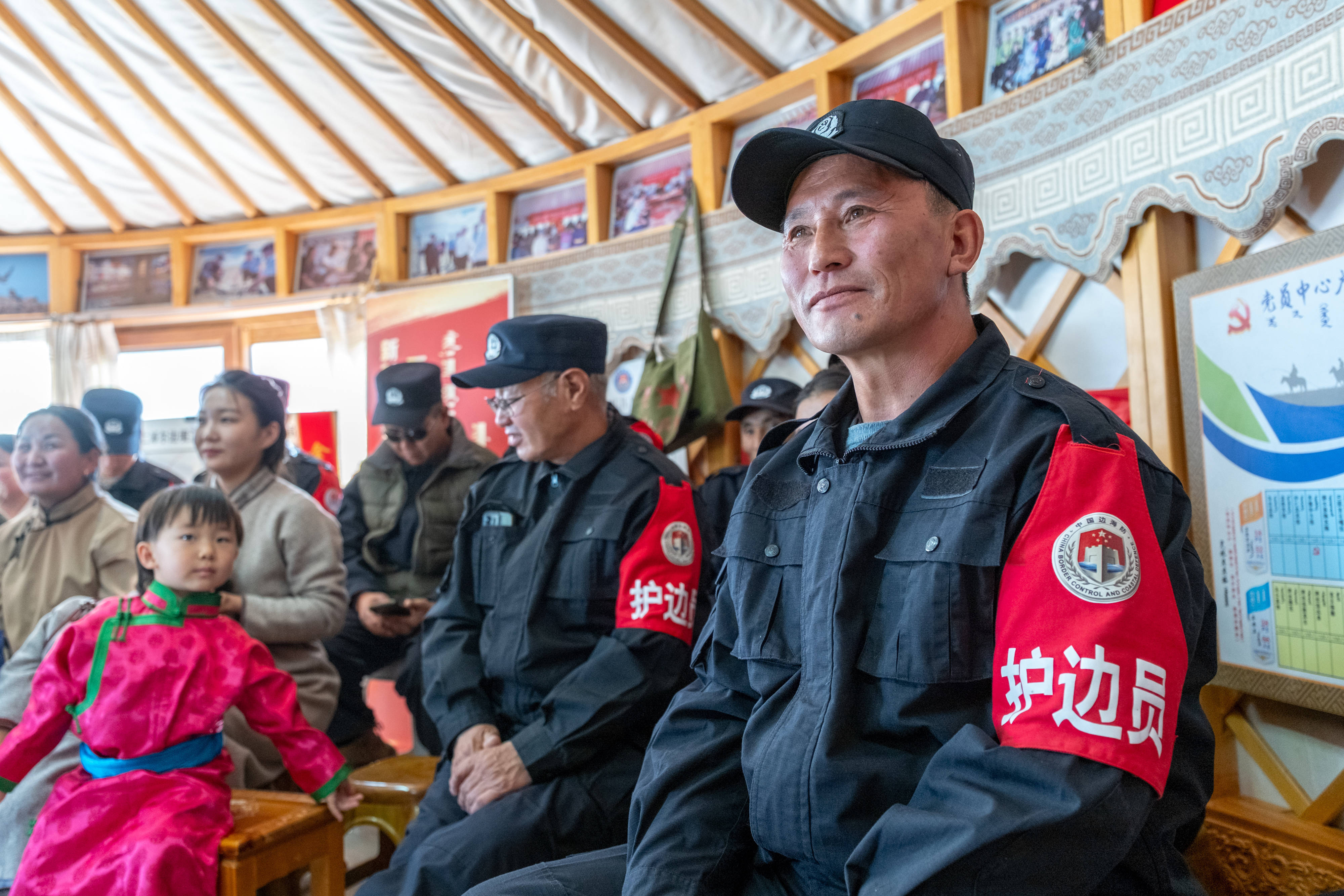 11月12日,在内蒙古锡林郭勒盟苏尼特右旗额仁淖尔苏木吉呼郎图嘎查赛音巴特尔护边驿站,护边员们在观看乌兰牧骑的演出。